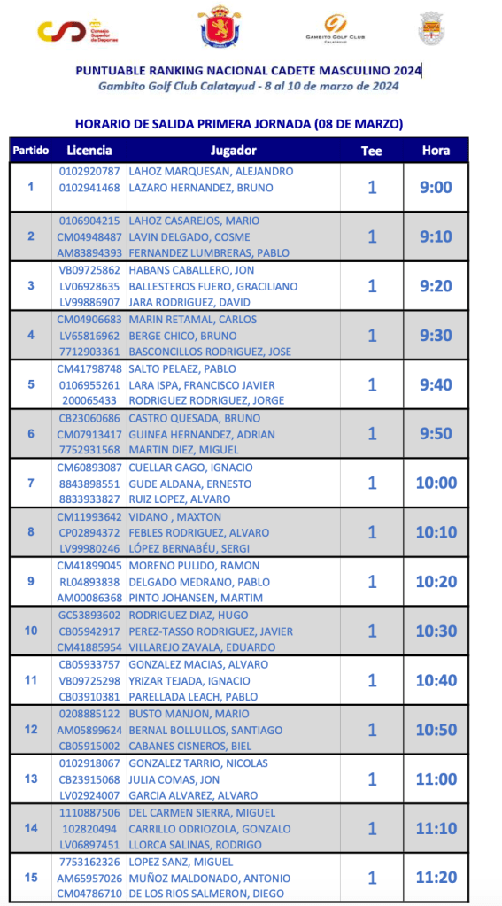 Salidas 1ª jornada Puntuable Ranking Nacional Cadete Masculino – GAMBITO GC CALATAYUD por Golf por Asturias en 8 marzo, 2024 Compártelo: Compartir en X (Se abre en una ventana nueva) X Comparte en Facebook (Se abre en una ventana nueva) Facebook Me gusta Cargando...