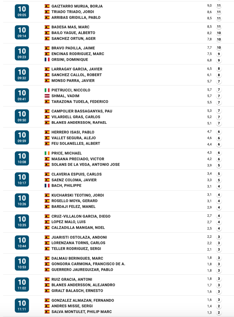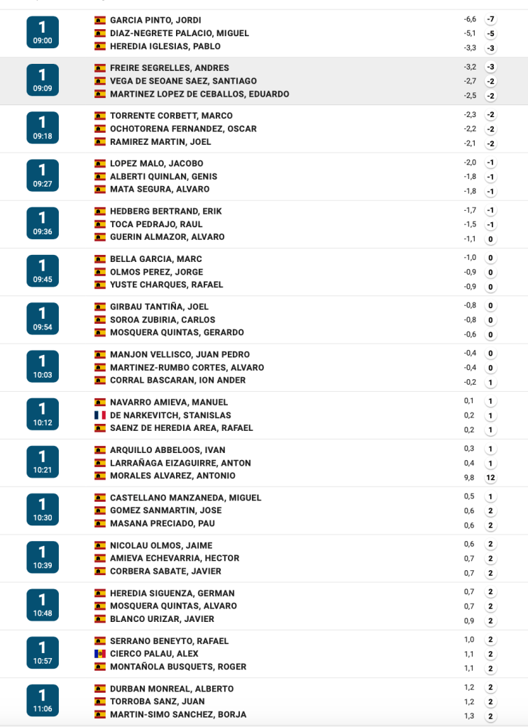 Miguel Diaz-Negrete inicia su vuelta por el Tee del 1 a las 9,00, Manuel Navarro dea las 10,12, Hector Amieva también por el Tee del 1 a las 10,39, la siguiente salida es para German Heredia y Javier Blanco