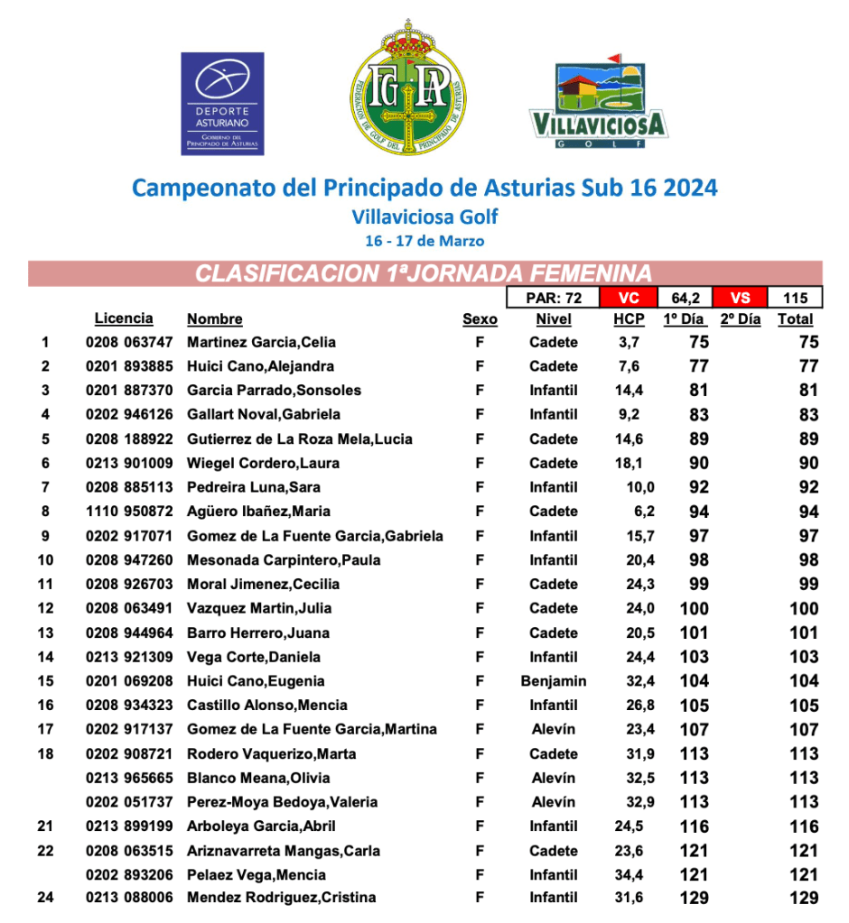 Resultados 1ª jornada Campeonato P. Asturias Sub 16 / Villaviciosa Golf por Golf por Asturias en 16 marzo, 2024 CLASIFICACION FEMENINA CLASIFICACION MASCULINA Compártelo: Compartir en X (Se abre en una ventana nueva) X Comparte en Facebook (Se abre en una ventana nueva) Facebook Me gusta Cargando...