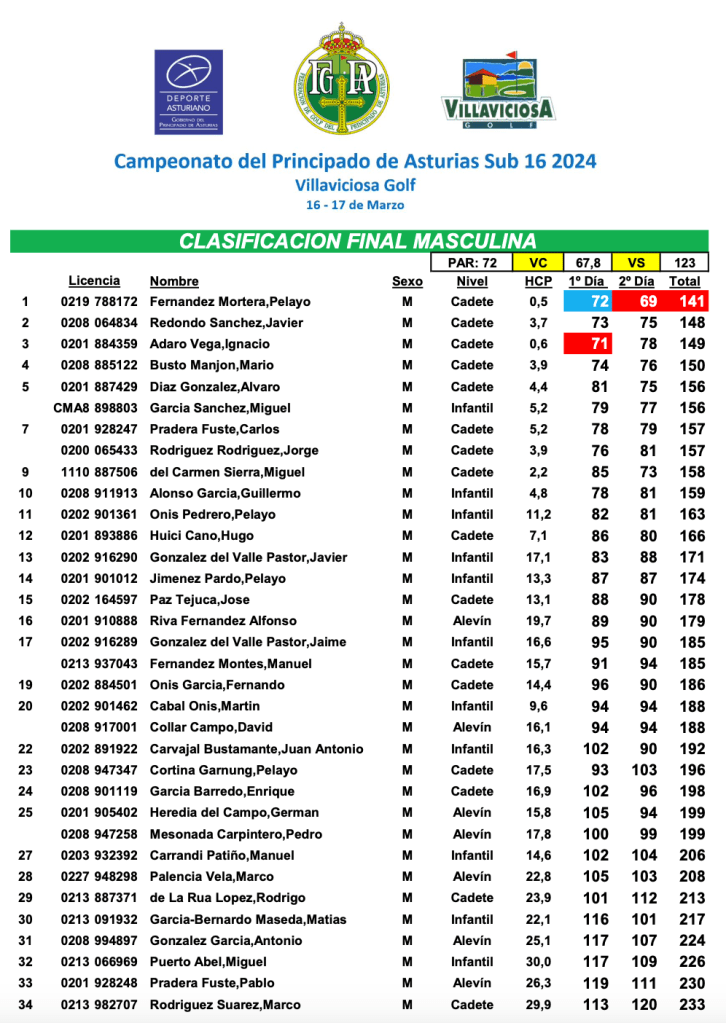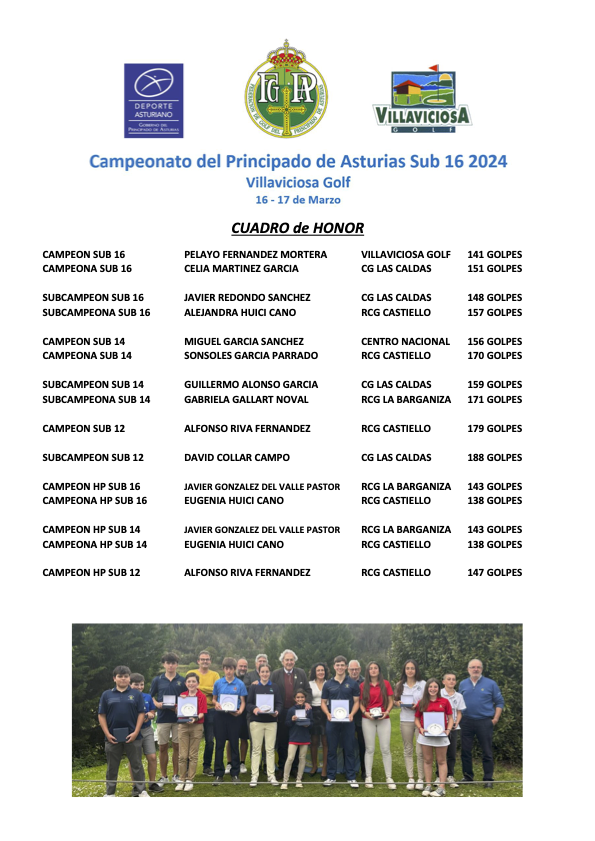 Celia Martinez Garcia con 151 golpes, tarjetas de 75 y 76, se proclama campeona femenina del Principado de Asturias Sub 16 en el recorrido de Villaviciosa Golf este fin de semana, por su parte, Pelayo Fernández Mortera, gana con 141 golpes en total y parciales de 72 y 69, es el nuevo campeón masculino Sub 16 del Principado de Asturias 2024.