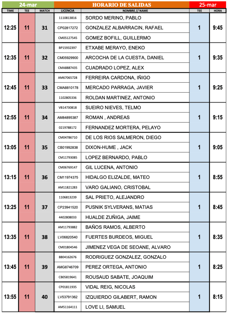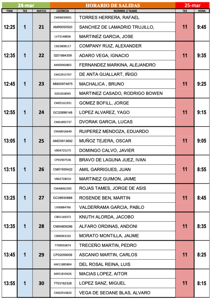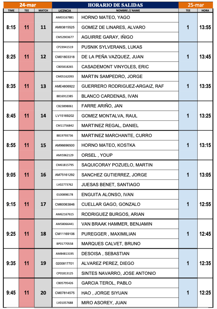 Horarios salidas 1ª y 2ª jornada Campeonato Nacional Individual Amateur Sub 18 2024 / La Faisanera ( Segovia) por Golf por Asturias en 23 marzo, 2024 foto FGPA Compártelo: Compartir en X (Se abre en una ventana nueva) X Comparte en Facebook (Se abre en una ventana nueva) Facebook Me gusta Cargando...