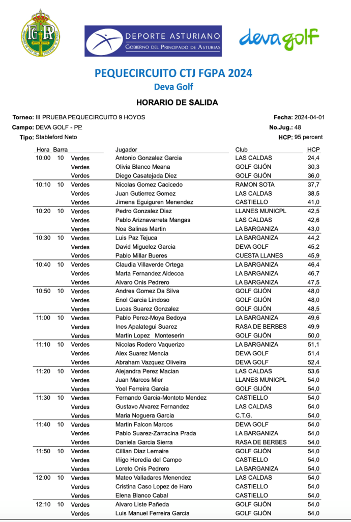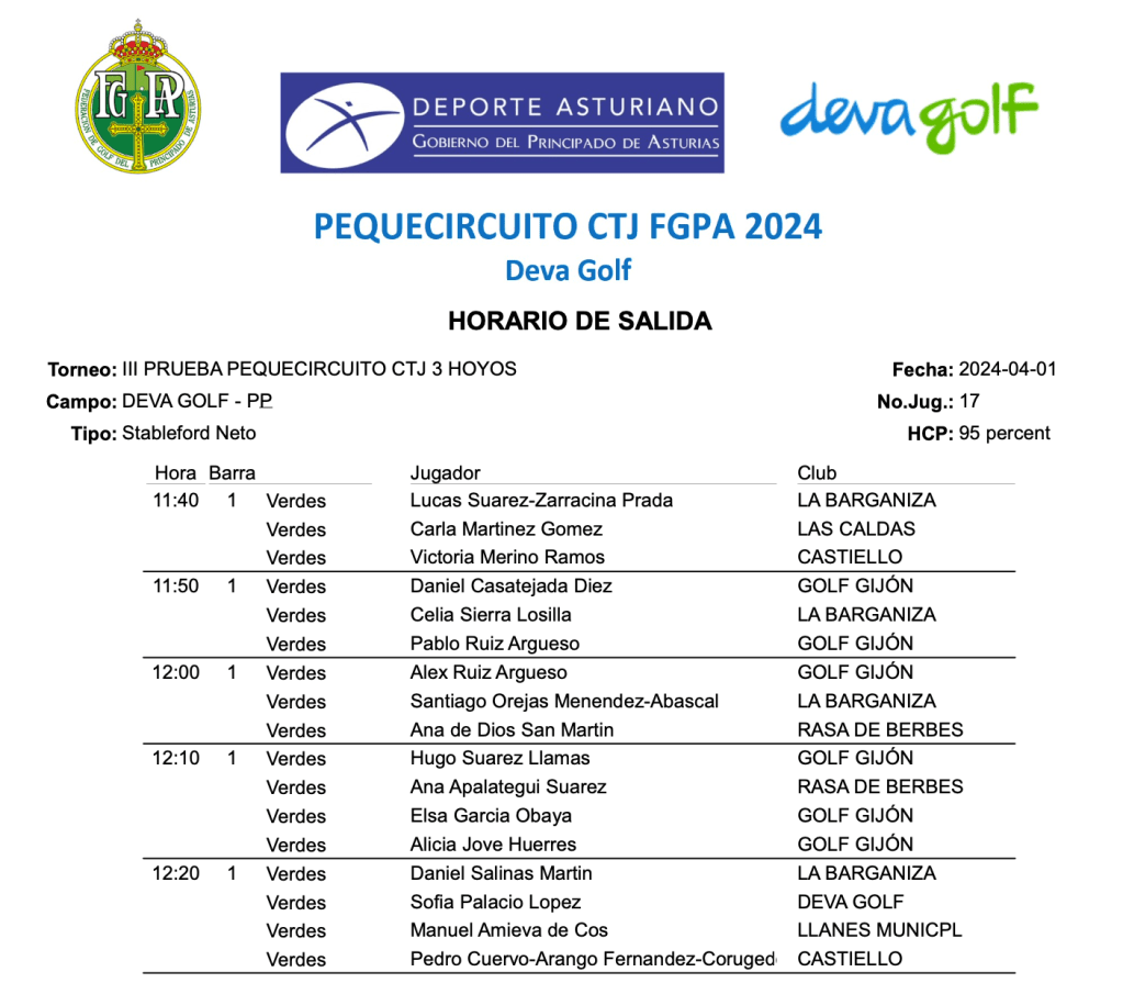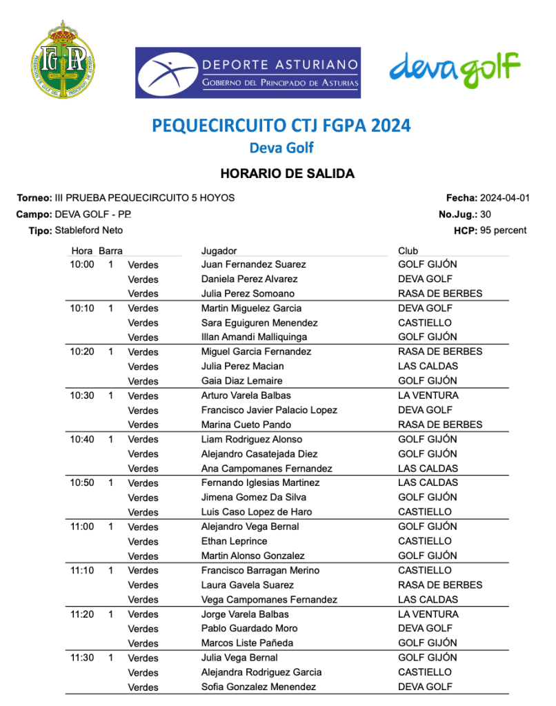Horarios de salida III prueba PEQUECIRCUITO 2024 / Deva Golf por Golf por Asturias en 31 marzo, 2024 Mañana 1 de abril se disputa una nueva prueba del PequeCircuito 2024, con diferentes salidas y numero de hoyos para los jugadores. SALIDAS 3 HOYOS SALIDAS 5 HOYOS SALIDAS 9 HOYOS Compártelo: Compartir en X (Se abre en una ventana nueva) X Comparte en Facebook (Se abre en una ventana nueva) Facebook Me gusta Cargando...