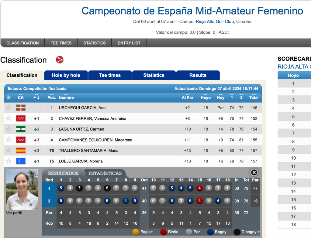 Tras dos jornadas de competición , nuestra única representante en el Mid-Amateur Femenino 2024 Norena Lueje, finaliza en el puesto quinto, con vueltas de 79 y 78 (157 total)