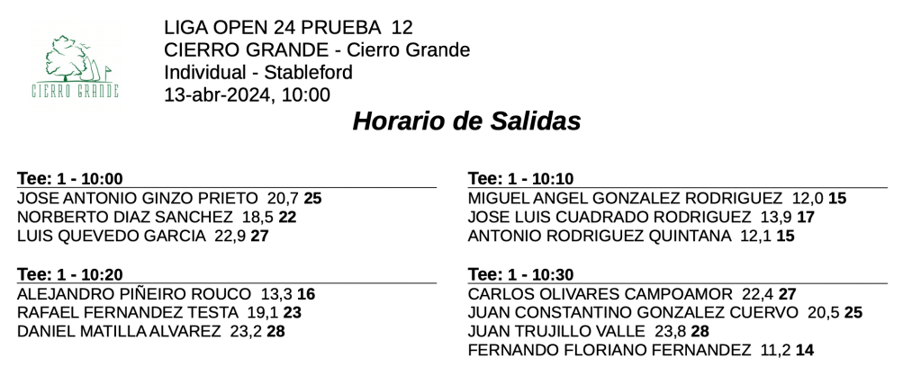 SALIDAS SABADO 12ª JORNADA LIGA OPEN 23/24 – CIERRO GRANDE GOLF por Golf por Asturias en 13 abril, 2024 Compártelo: Compartir en X (Se abre en una ventana nueva) X Comparte en Facebook (Se abre en una ventana nueva) Facebook Me gusta Cargando...