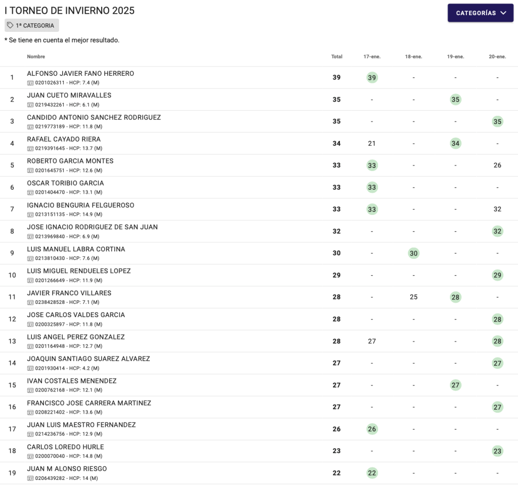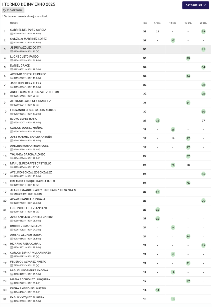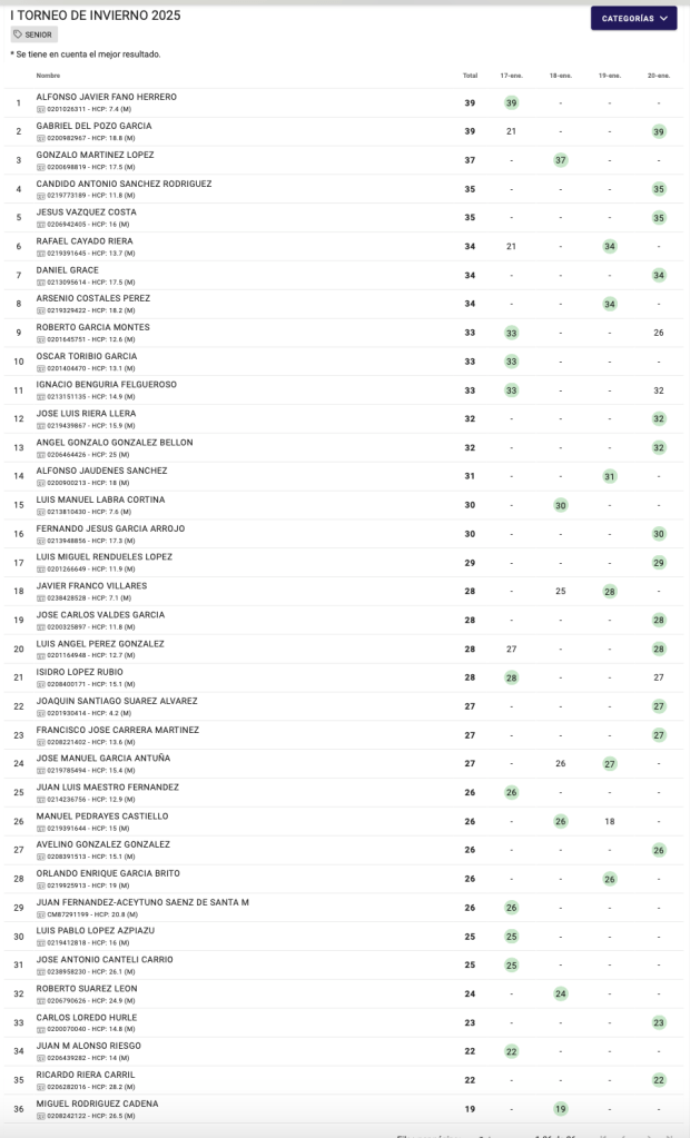 RESULTADOS I TORNEO INVIERNO 2025 / VILLAVICIOSA GOLF por Golf por Asturias en 21 enero, 2025 CUADRO DE HONOR 1ª CATEGORIA 2ª CATEGORIA CATEGORIA DAMAS CATEGORIA SENIOR Compártelo: Compartir en X (Se abre en una ventana nueva) X Comparte en Facebook (Se abre en una ventana nueva) Facebook Me gusta Cargando...