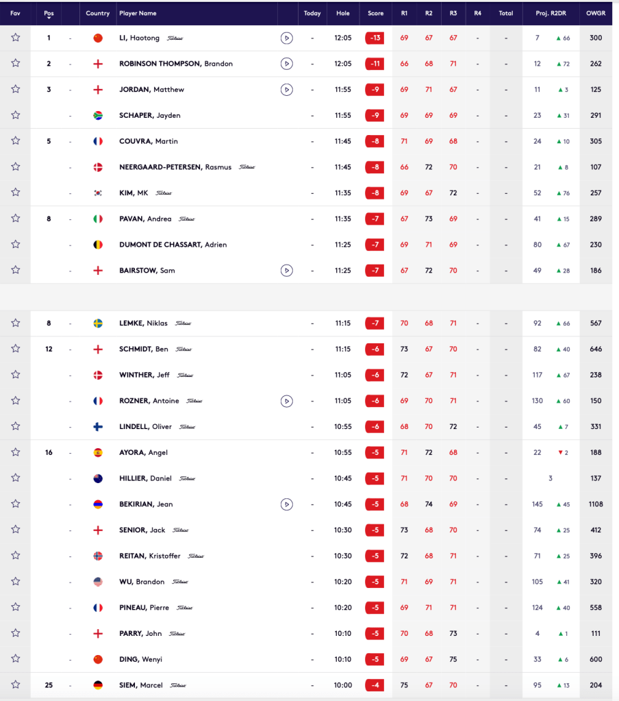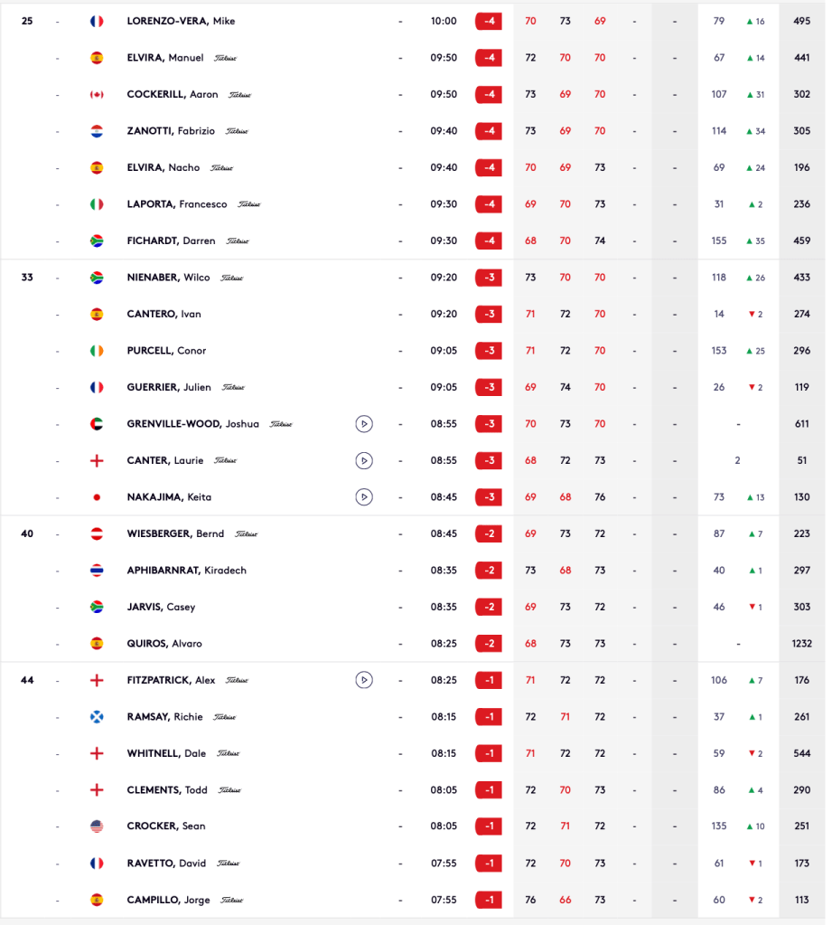 Despues de superar el corte de la jornada del viernes, nuestro mejor español clasificado en la 3ª jornada es Angel Ayora puesto 16º con -5, siguientes son los hermanos Elvira con -4, el asturiano Ivan Cantero con -3, Alvaro Quiros con -2, Jorge Campillo con -1 al igual que Angell Hidalgo y con PAR el otro asturiano Alfredo Garcia-Heredia.