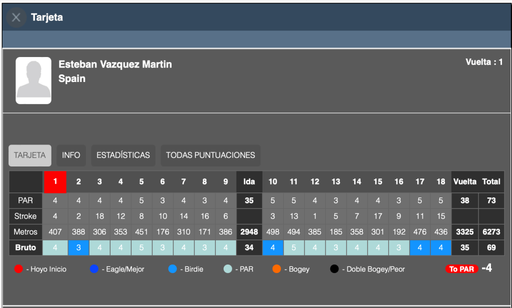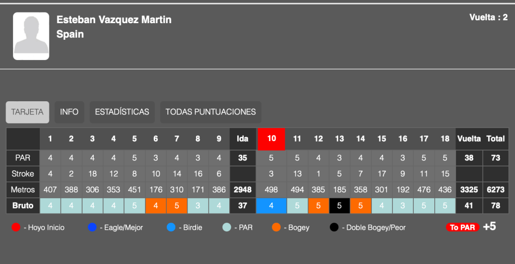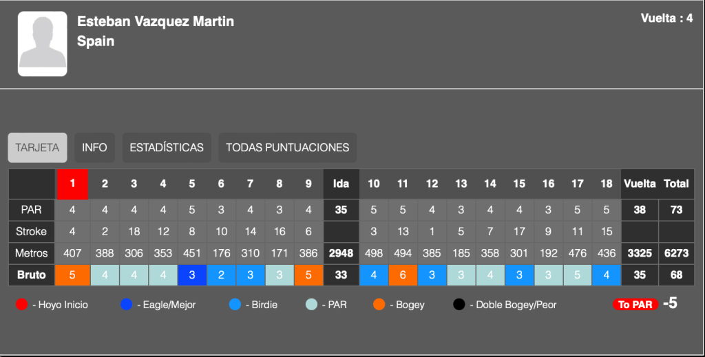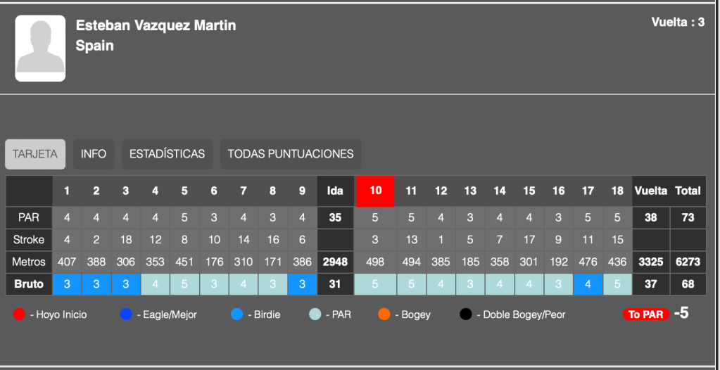 Después de superar el corte, Esteban Vazquez finaliza con una vuelta de 68 golpes, para situarse en la décimo quinta plaza de la clasificación, Esteban entrego tarjetas de 69, 78, 68 y 68