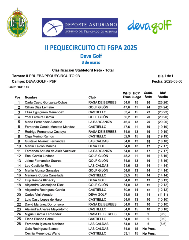 Carla Cueto Gonzalez – Cobo es la campeona de 9 hoyos B con 26 puntos, seguida de Cillian Diaz Lamaire con 24