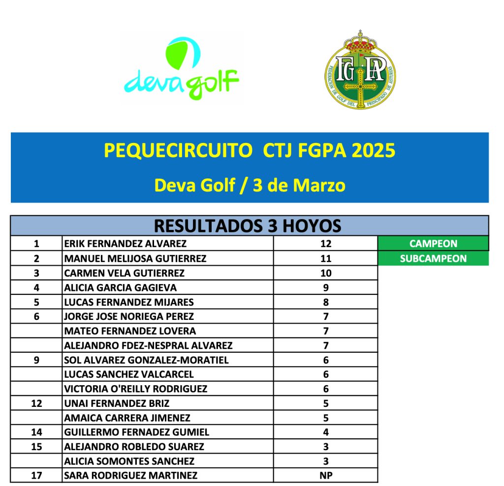 En categoria de 3 hoyos el campeón fue Erik Fernandez Alvarez con 12, seguido de Manuel Melijosa Gutierrez con 11