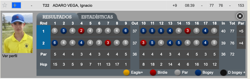 Ignacio Adaro con vueltas de 77 y 76, se posiciona para esta ultima vuelta en el puesto 22º con 153 golpes en total