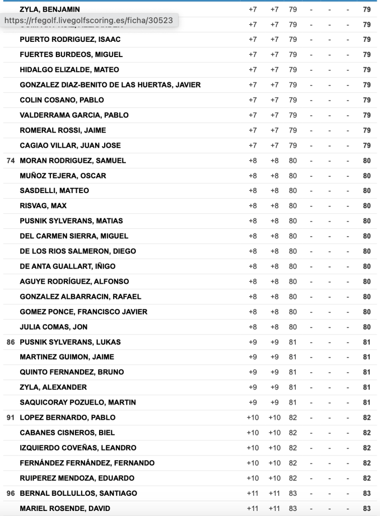 Ignacio Adaro con 73 golpes se situa en el puesto 14º con +1, Rodrigo b Martinez necesitó dos golpes más que Adaro para completar su vuelta y colocarse en el puesto 26º, todos ellos están dentro del corte virtual.