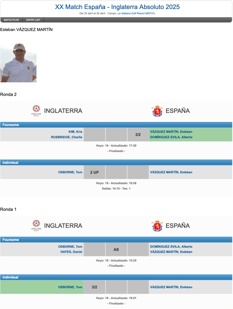 2ª Jornada XX Match España – Inglaterra Absoluto Mixto 2025 por Golf por Asturias en 26 abril, 2025 El asturiano Esteban Vazquez gana junto a Alberto Dominguez el Foursome de la mañana, por la tarde se enfrenta a Tom Osborne con el que pierde de dos arriba para el ingles . Compártelo: Compartir en X (Se abre en una ventana nueva) X Comparte en Facebook (Se abre en una ventana nueva) Facebook Me gusta Cargando...