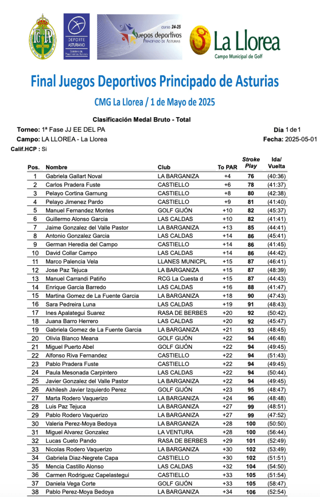 Resultados 1ª fase Juegos Escolares 2025 / C.M. Golf La Llorea por Golf por Asturias en 1 mayo, 2025 RESULTADOS 9 HOYOS RESULTADOS 18 HOYOS Compártelo: Haz clic para compartir en X (Se abre en una ventana nueva) X Haz clic para compartir en Facebook (Se abre en una ventana nueva) Facebook Me gusta Cargando...