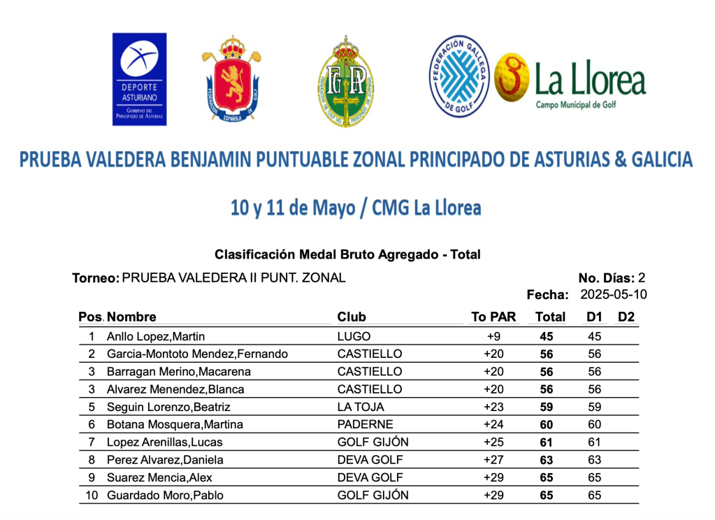 La clasificación de ,los más pequeños ( benjamines) esta liderada por el lucense Martin Anllo con 45, segundo y tercer puesto para tres asturianos, Fernando Garcia Montoto, Macarena Barragan y Blanca Alvarez