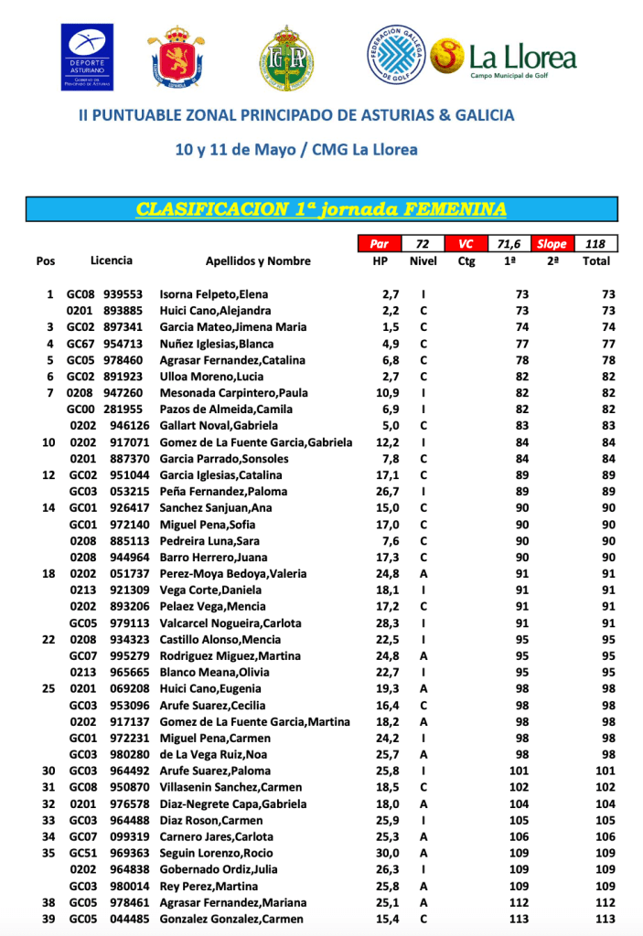 Despues de la primera jornada de este zonal P. de Asturias – Galicia, la gallega Elena Isorna y la asturiana Alejandra Huici mandan la clasificación femenina