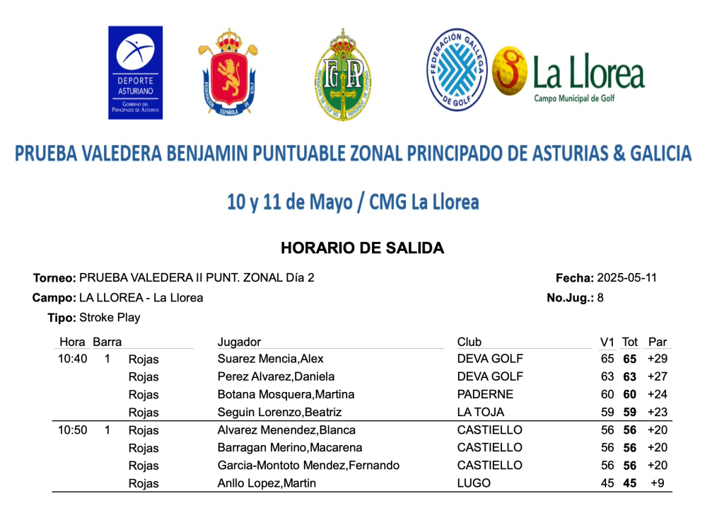 HORARIOS SALIDAS 2ª JORNADA PUNTUABLE ZONAL ASTURIAS-GALICIA 2025 / CM GOLF LA LLOREA por Golf por Asturias en 11 mayo, 2025 SALIDAS BENJAMINES SALIDAS PUNTUABLE ZONAL Compártelo: Haz clic para compartir en X (Se abre en una ventana nueva) X Haz clic para compartir en Facebook (Se abre en una ventana nueva) Facebook Me gusta Cargando...