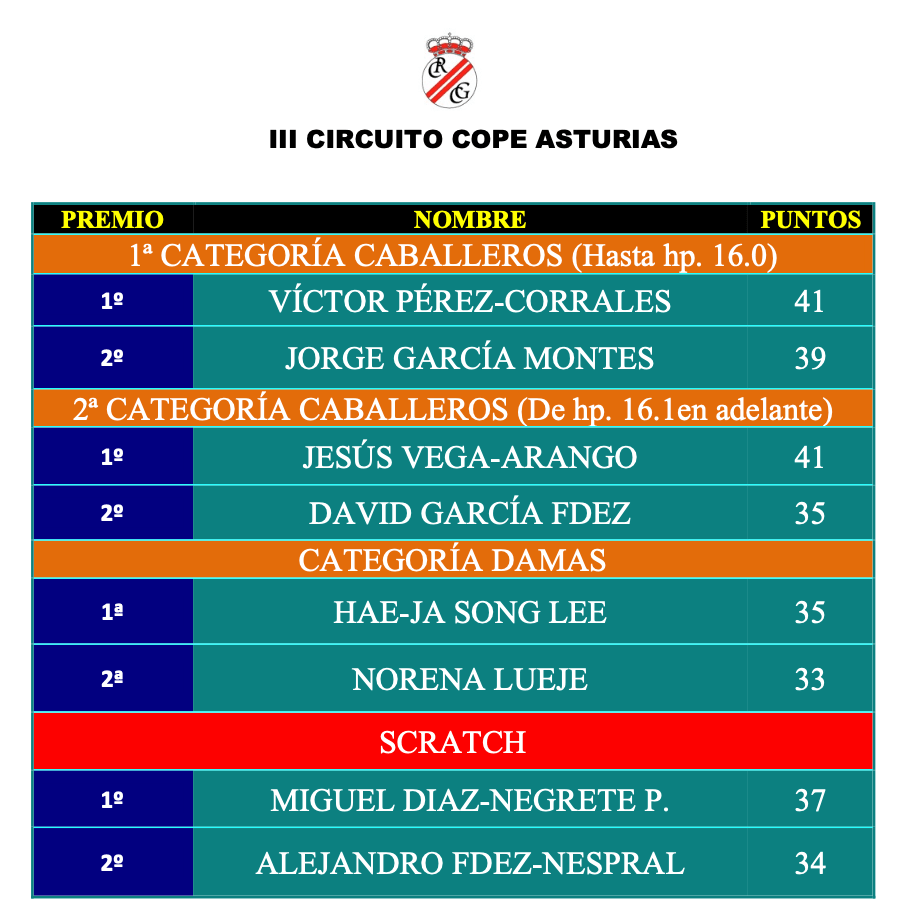Victor Perez-Corrales gana con 41 puntos la primera categoria del III Circuito Copa Asturias, segundo fue Jorge Garcia Montes con 39 puntos