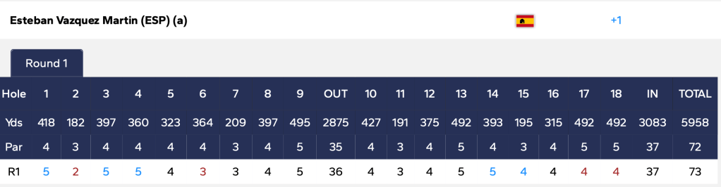 ESTEBAN VAZQUEZ 73 GOLPES EN LA PRIMERA JORNADA DEL LACANAU / Alps Tour 2025 por Golf por Asturias en 24 mayo, 2025 Es asturiano Esteban Vázquez entrega una tarjeta de 73 golpes, uno sobre el Par del campo en la primera jornada del Lacanau Alps Open. Compártelo: Compartir en X (Se abre en una ventana nueva) X Comparte en Facebook (Se abre en una ventana nueva) Facebook Me gusta Cargando...