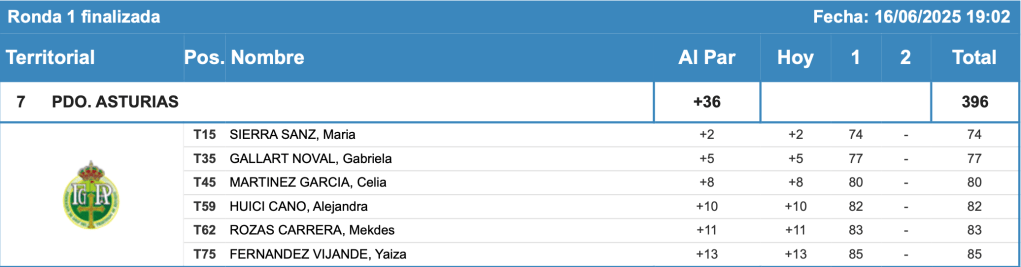 Después de jugarse la primera jornada del Campeonato de España FF AA Femenino, el equipo asturiano se sitúa en el séptimo puesto a falta de la segunda jornada que decide las posiciones de Match Play, 396 golpes en total para nuestras chicas, están tan solo a dos golpes de diferencia con las representantes aragonesas (394), empatadas con el conjunto balear ( octavas) y aventajan en un golpes al combinado de Castilla-Leon ( 397)