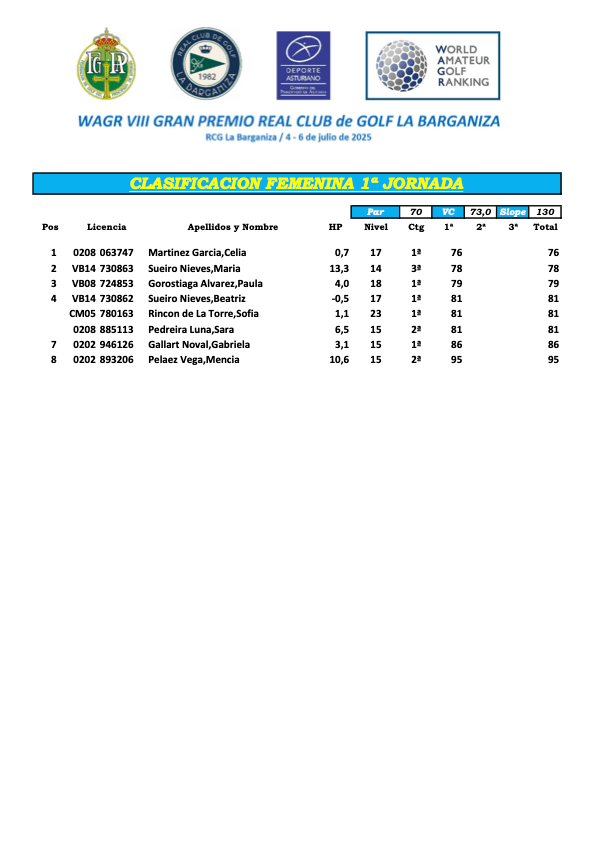 La asturiana Celia Martinez Garcia entrega una tarjeta de 76 golpes , con dos golpes más, Marta Sueiro Nieves y tercera es Paula Gorostiaga con 79 golpes