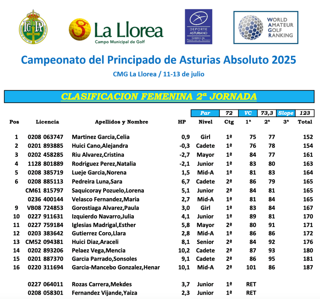 La segunda jornada del campeonato absoluto del P. de Asturias 2025 deja a Celia Martinez y Carlos Fdez. Mortera como lideres de la prueba en la segunda jornada.