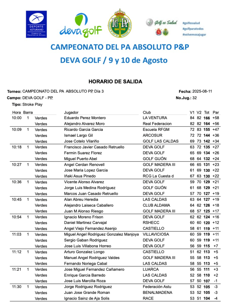 SALIDAS 3ª VUELTA CAMPEONATO P. DE ASTURIAS ABSOLUTO DE P&P 2025 / DEVA GOLF por Golf por Asturias en 10 agosto, 2025 Compártelo: Compartir en X (Se abre en una ventana nueva) X Comparte en Facebook (Se abre en una ventana nueva) Facebook Me gusta Cargando...