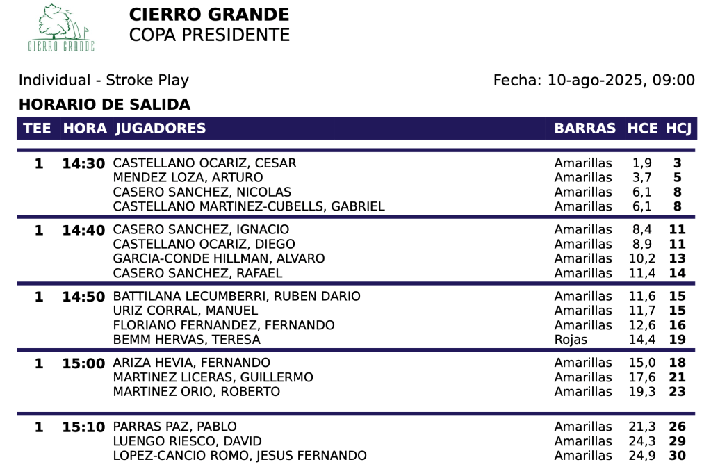 SALIDAS TORNEO COPA PRESIDENTE / CIERRO GRANDE GOLF por Golf por Asturias en 10 agosto, 2025 SALIDAS VIERNES SALIDAS SABADO SALIDAS DOMINGO Compártelo: Haz clic para compartir en X (Se abre en una ventana nueva) X Haz clic para compartir en Facebook (Se abre en una ventana nueva) Facebook Me gusta Cargando...