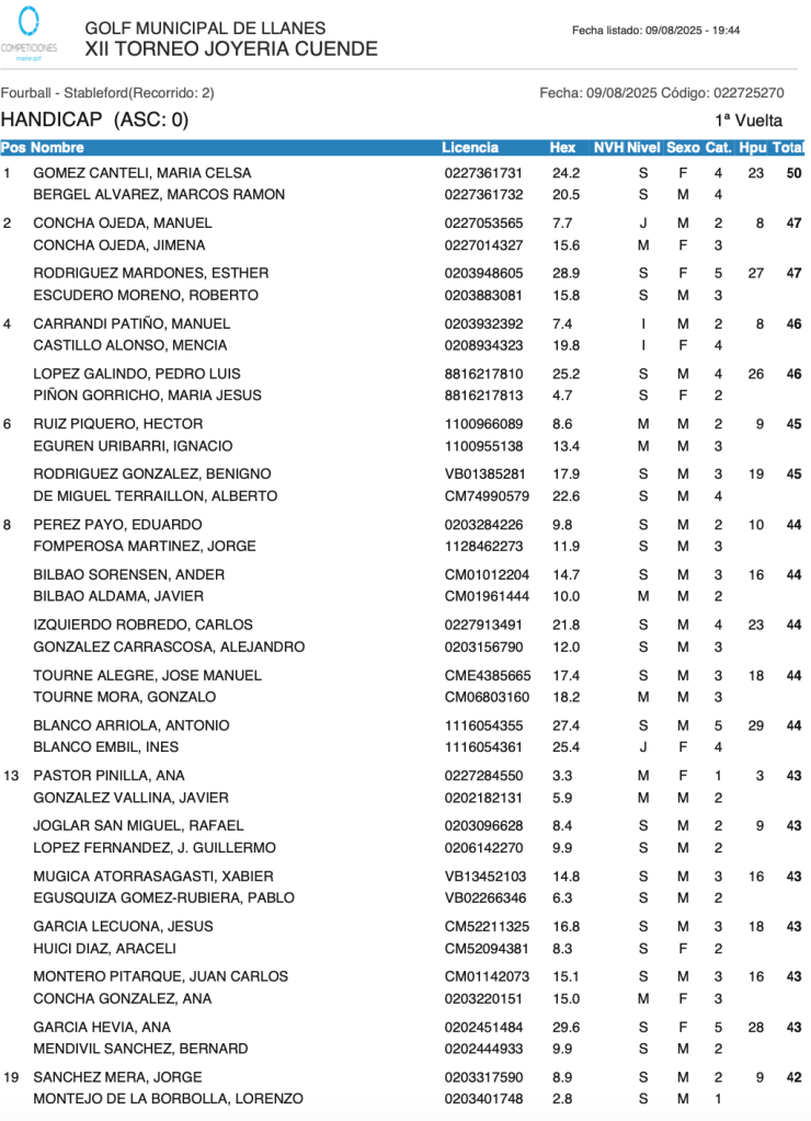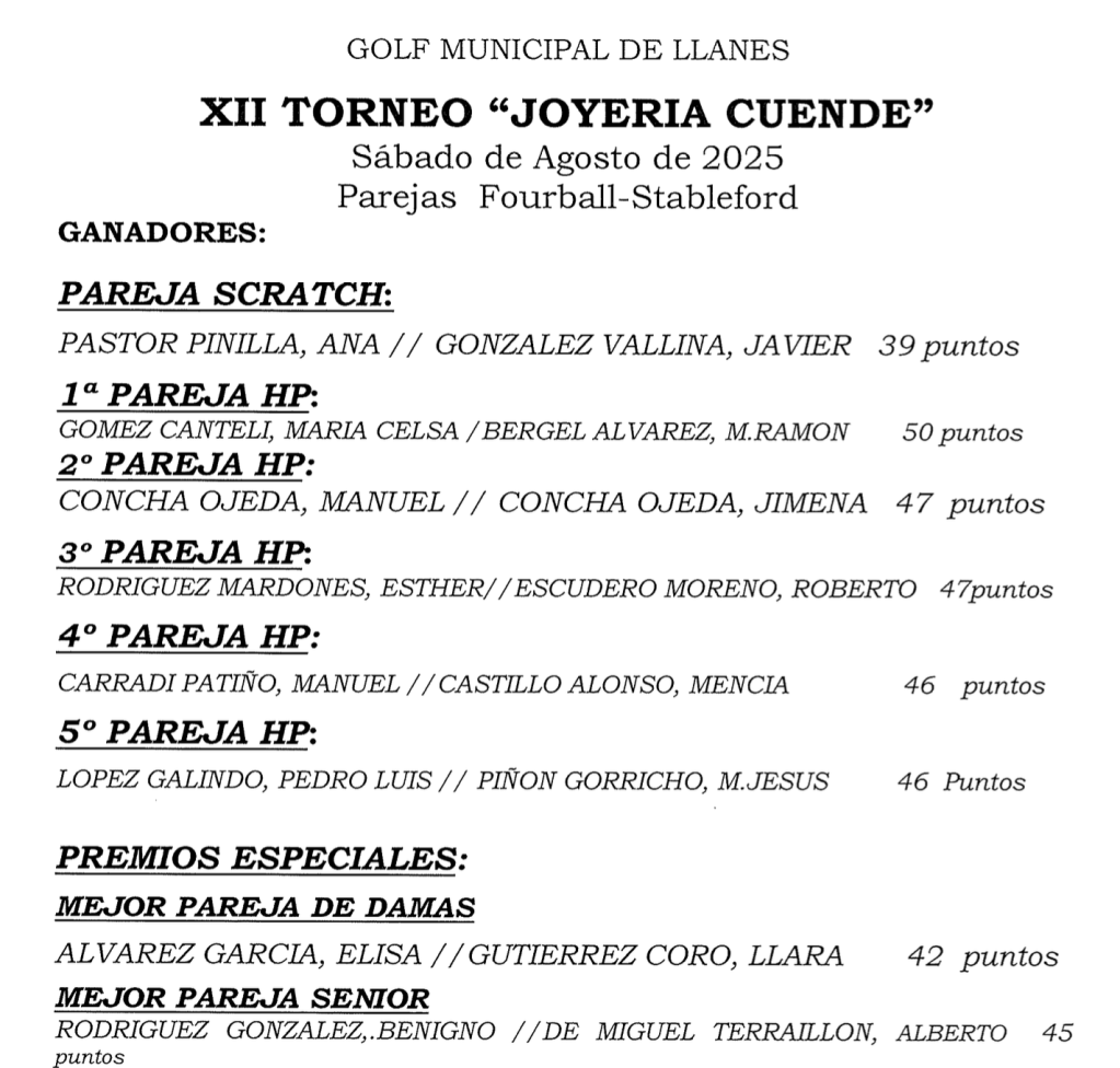 RESULTADOS XII TORNEO JOYERIA CUENDE / CM GOLF LLANES por Golf por Asturias en 12 agosto, 2025 CUADRO DE HONOR CLASIFICACION HANDICAP Compártelo: Haz clic para compartir en X (Se abre en una ventana nueva) X Haz clic para compartir en Facebook (Se abre en una ventana nueva) Facebook Me gusta Cargando...