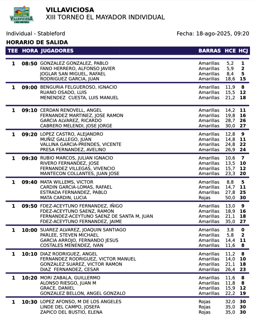 SALIDAS LUNES XIII TORNEO «EL MAYADOR» 2025 / VILLAVICIOSA GOLF por Golf por Asturias en 18 agosto, 2025 SALIDAS MAÑANA SALIDAS TARDE Compártelo: Haz clic para compartir en X (Se abre en una ventana nueva) X Haz clic para compartir en Facebook (Se abre en una ventana nueva) Facebook Me gusta Cargando...