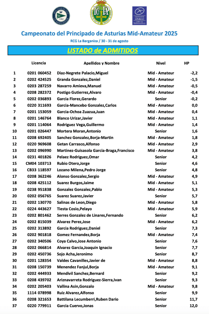 CAMPEONATO DEL PRINCIPADO DE ASTURIAS MID-AMATEUR 2025 / RCG BARGANIZA por Golf por Asturias en 29 agosto, 2025 JUGADORAS ADMITIDAS JUGADORES ADMITIDOS Compártelo: Haz clic para compartir en X (Se abre en una ventana nueva) X Haz clic para compartir en Facebook (Se abre en una ventana nueva) Facebook Me gusta Cargando...