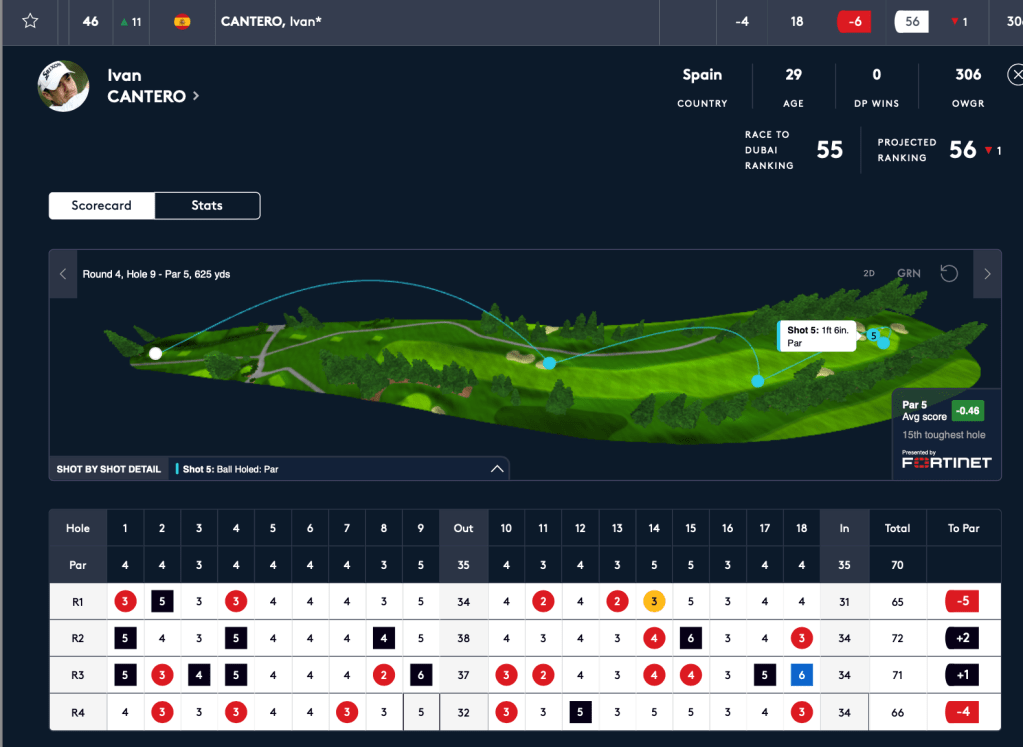 El mejor español clasificado fue Angel Ayora con -15 y puesto 8º, Alejandro del Rey en el 41º con -7, los hermanos Elvira ( Nacho y Manuel) acaban con -3 y puesto 55º, Angel Hidalgo termina ultimo con +9