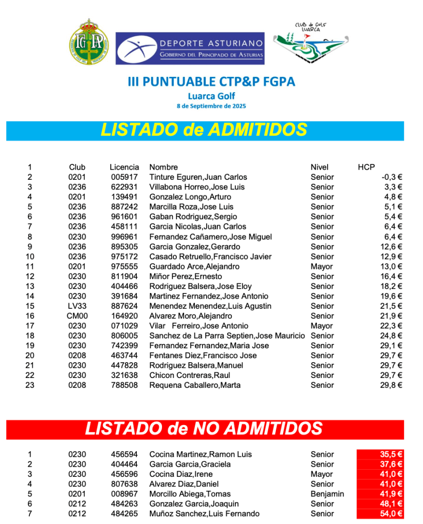 Según apartado Inscripciones punto nº 9 de la circular 18/2018 del Reglamento General de Competiciones de la Federacion de Golf del Principado de Asturias