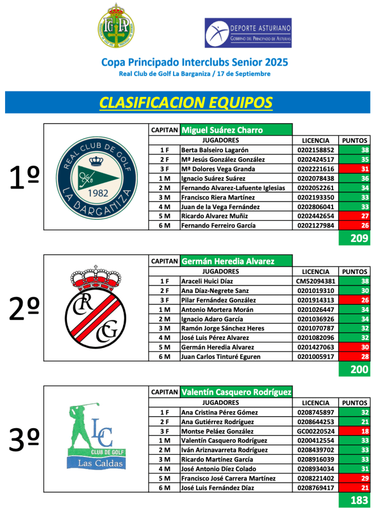 El RCG de la Barganiza es el ganador de esta primera edición de la Copa Principado de Asturias Senior, prueba realizada sobre los 18 hoyos del RCG de la Barganiza.