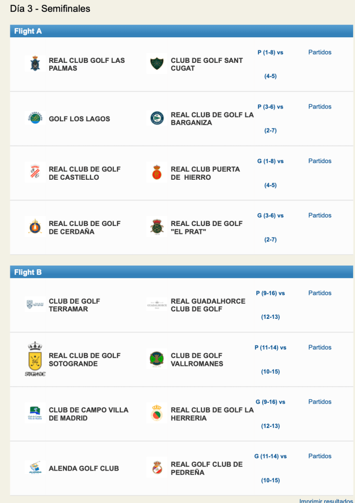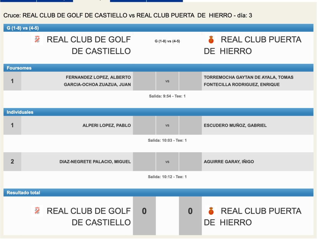 SALIDAS 3ª JORNADA CAMPEONATO INTERCLUBES MASCULINO 2025 / RCG CASTIELLO por Golf por Asturias en 27 septiembre, 2025 RCG CASTIELLO RCG BARGANIZA CUADRO SEMIFINALES 1º Y 2º FLIGHT Compártelo: Haz clic para compartir en X (Se abre en una ventana nueva) X Haz clic para compartir en Facebook (Se abre en una ventana nueva) Facebook Me gusta Cargando...
