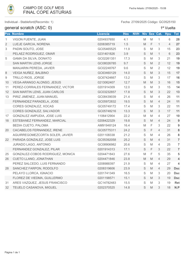 El handicap fue para Donato Gama Da Silva, creo que a muchos os sonara como jugador del Deporte hace años, Juan Vigon Fuente fue el mejor asturiano clasificado en quinta plaza, Norena Lueje termina en el Top Ten junto al también asturiano Marcial Estebanez