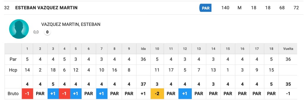 Esteban Vazquez firma una primera jornada de -4 , se situa en el puesto 5º, ayer su tarjeta marcaba el Par del campo, es puesto 32º de la clasificación a falta de la ultima jornada.