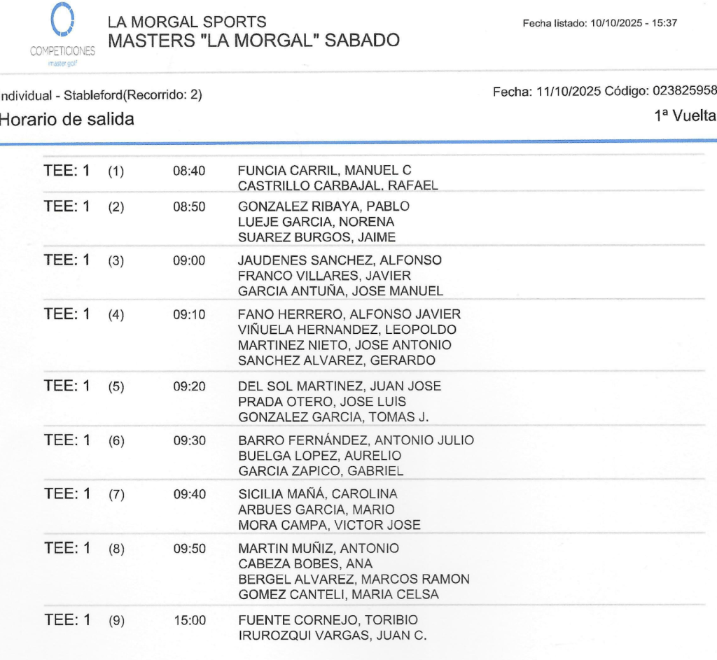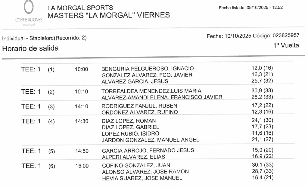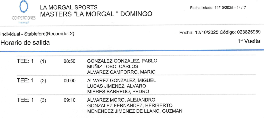 SALIDAS GRAN TORNEO MASTERS 2025 / GOLF LA MORGAL por Golf por Asturias en 11 octubre, 2025 SALIDAS VIERNES SALIDAS SABADO SALIDAS DOMINGO Compártelo: Haz clic para compartir en X (Se abre en una ventana nueva) X Haz clic para compartir en Facebook (Se abre en una ventana nueva) Facebook Me gusta Cargando...