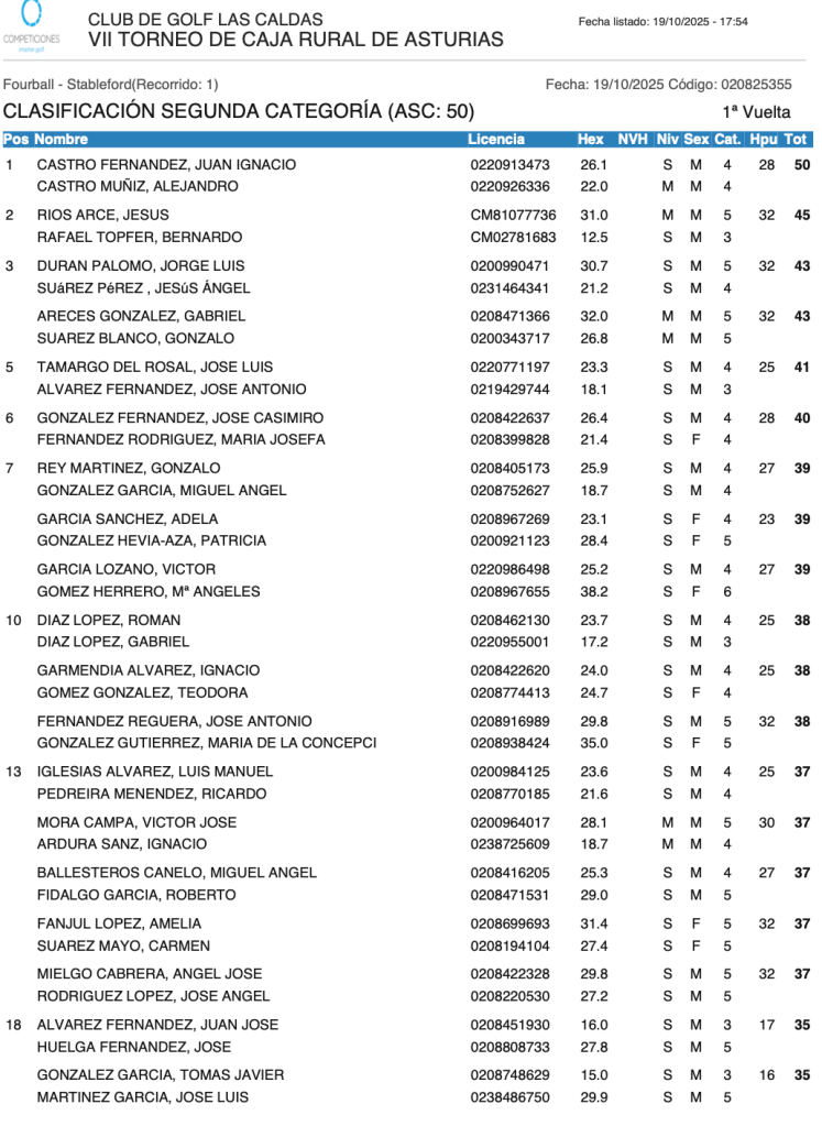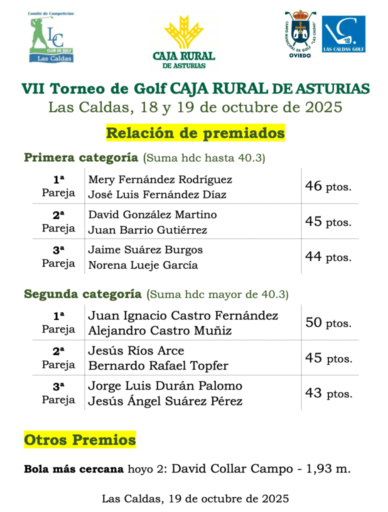 RESULTADOS VII TORNEO DE GOLF CAJA RURAL DE ASTURIAS / C.M. GOLF LAS CALDAS por Golf por Asturias en 22 octubre, 2025 CUADRO DE HONOR CLASIFICACION 1ª CATEGORIA CLASIFICACION 2ª CATEGORIA FOTO CMGOLF LAS CALDAS Compártelo: Haz clic para compartir en X (Se abre en una ventana nueva) X Haz clic para compartir en Facebook (Se abre en una ventana nueva) Facebook Me gusta Cargando...