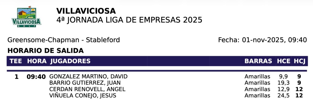 SALIDAS SABADO 4ª JORNADA LIGA EMPRESAS 2025 VILLAVICIOSA GOLF por Golf por Asturias en 31 octubre, 2025 Screenshot Compártelo: Haz clic para compartir en X (Se abre en una ventana nueva) X Haz clic para compartir en Facebook (Se abre en una ventana nueva) Facebook Me gusta Cargando...