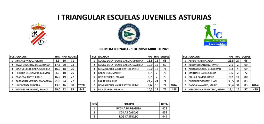 RESULTADOS 1ª JORNADA I TRIANGULAR ESCUELAS JUVENILES ASTURIAS / RCG BARGANIZA por Golf por Asturias en 1 noviembre, 2025 El RCG de la Baraganiza lidera este primera jornada del triangular de escuelas juveniles de asturias 2025 fotos cortesia RCG Barganiza Compártelo: Haz clic para compartir en X (Se abre en una ventana nueva) X Haz clic para compartir en Facebook (Se abre en una ventana nueva) Facebook Me gusta Cargando...