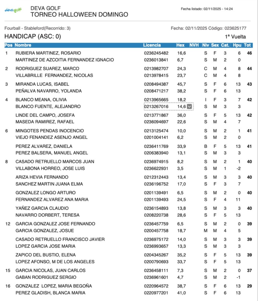 RESULTADOS TORNEO HALLOWEEN 2025 / DEVA GOLF por Golf por Asturias en 3 noviembre, 2025 Rosario Rubiera e Ignacio Martinez de Azcoitia ganan el torneo de Halloween 2025 en Deva Golf Compártelo: Haz clic para compartir en X (Se abre en una ventana nueva) X Haz clic para compartir en Facebook (Se abre en una ventana nueva) Facebook Me gusta Cargando...