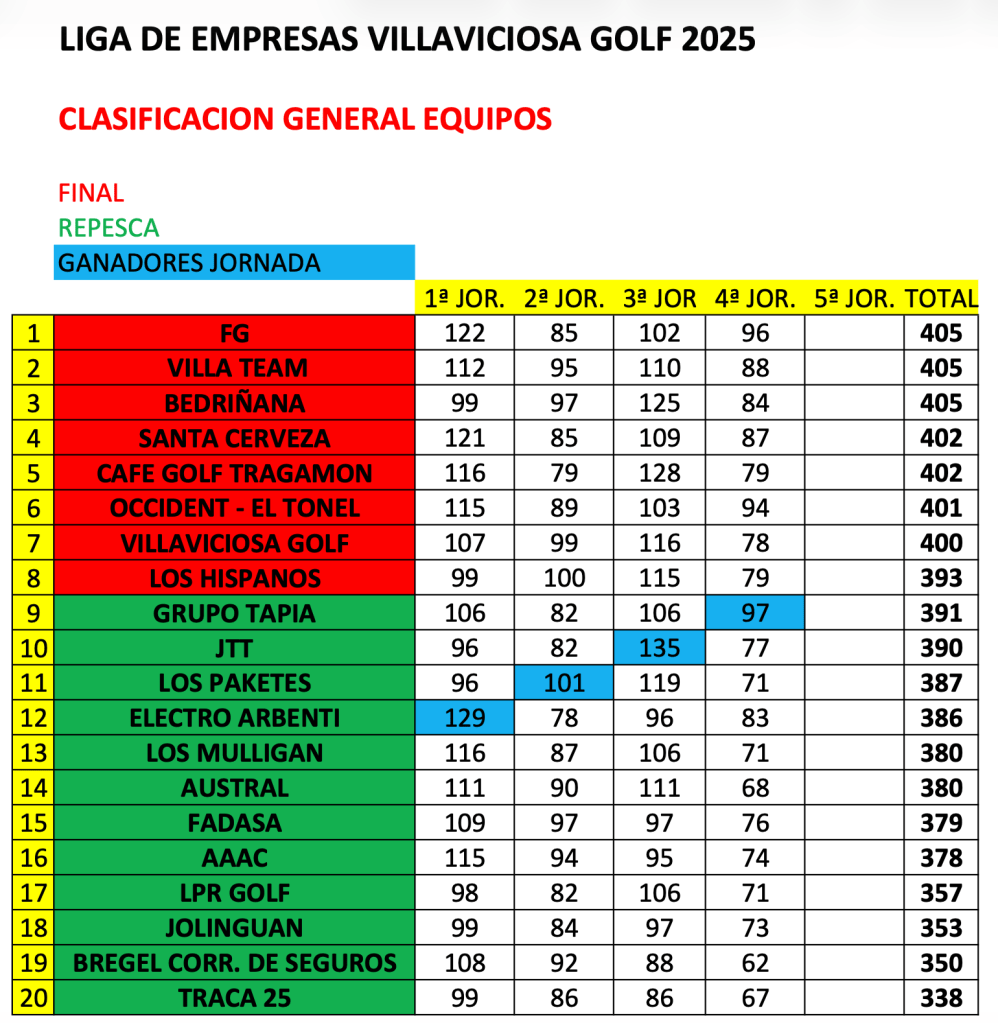 CLASIFICACION GENERAL CUATRO JORNADAS + FOTOS LIGA EMPRESAS 2025 / VILLAVICIOSA GOLF por Golf por Asturias en 4 noviembre, 2025 Compártelo: Haz clic para compartir en X (Se abre en una ventana nueva) X Haz clic para compartir en Facebook (Se abre en una ventana nueva) Facebook Me gusta Cargando...