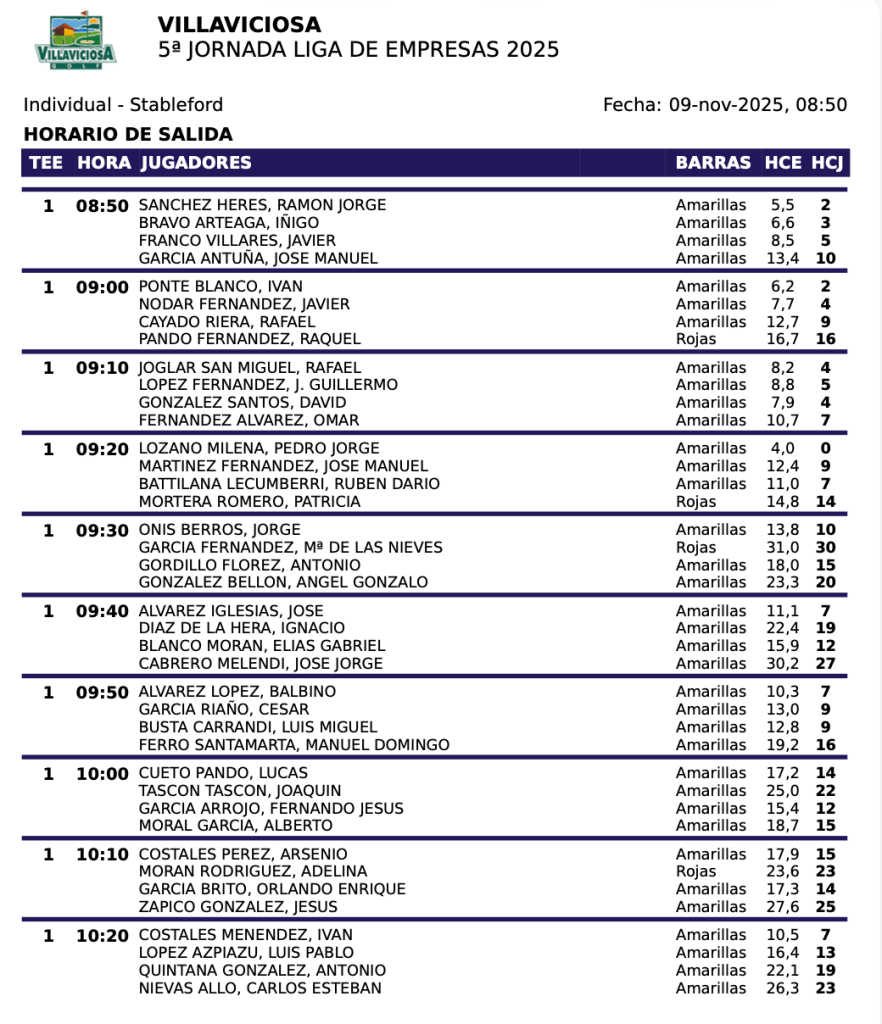 SALIDAS DOMINGO 5ª JORNADA LIGA EMPRESAS 2025 / VILLAVICIOSA GOLF por Golf por Asturias en 9 noviembre, 2025 Compártelo: Compartir en X (Se abre en una ventana nueva) X Comparte en Facebook (Se abre en una ventana nueva) Facebook Me gusta Cargando...