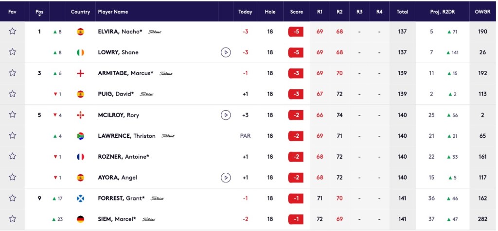 La segunda jornada nos trae buenas noticias también, Nacho Elvira se posiciona colíder, una tarjeta de 68 golpes lo lleva a coliderar la primera plaza con Shane Lowry, mala jornada para Rory Macilroy que realiza una vuelta de74 golpes, baja a la quinta posición.