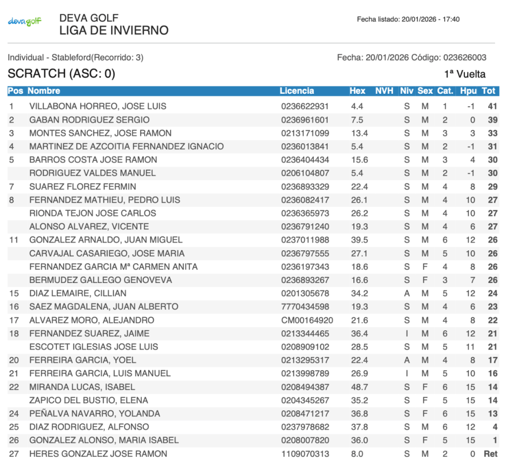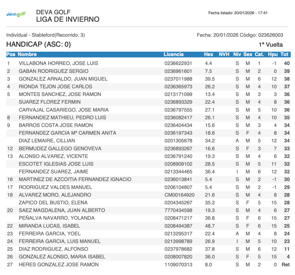 Resultados 2ª jornada Liga invierno 2026 / Deva Golf por Golf por Asturias en 21 enero, 2026 CLASIFICACION SCRATCH CLASIFICACION HANDICAP Compártelo: Compartir en X (Se abre en una ventana nueva) X Comparte en Facebook (Se abre en una ventana nueva) Facebook Me gusta Cargando...