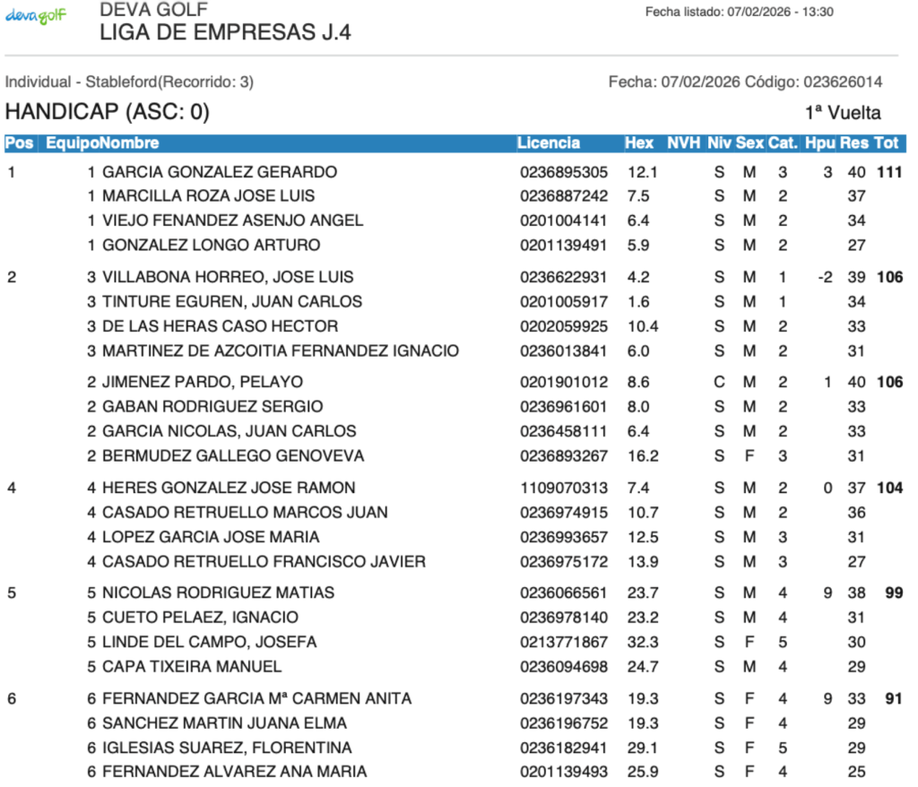 RESULTADOS 4ª JORNADA LIGA EMPRESAS 2026 / DEVA GOLF por Golf por Asturias en 10 febrero, 2026 CLASIFICACION HANDICAP PRUEBA CLASIFICACION SCRATCH PRUEBA CLASIFICACION EQUIPOS 4ª PRUEBA Compártelo: Compartir en X (Se abre en una ventana nueva) X Comparte en Facebook (Se abre en una ventana nueva) Facebook Me gusta Cargando...