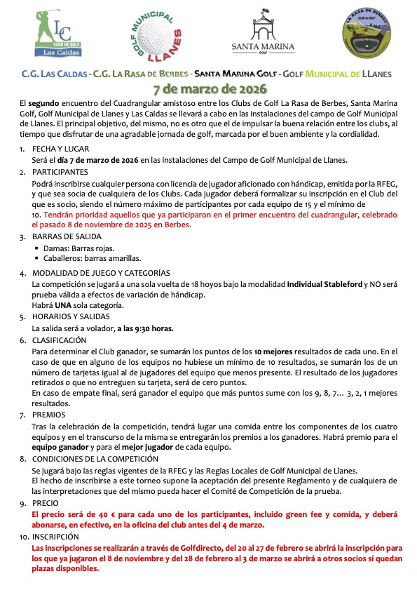 Desde Golf La Rasa de Berbes nos indican un cambio en la fecha de celebración del TRIANGULAR BERBES – CALDAS – LLANES, las mañas condiciónese atmosféricas del sábado del 7 de marzo, hacen trasladar el torneo al domingo 8 de marzo.