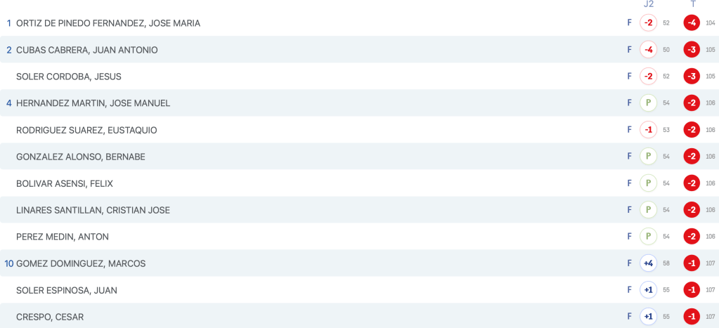 RESULTADOS 1ª JORNADA CAMPEONATO ESPAÑA MASCULINO P&P 2026 / LAS PALMERAS GOLF por Golf por Asturias en 7 marzo, 2026 Mejor asturiano clasificado Jose Miguel Fdez Cañamero RESULTADOS SCRATCH 1ª JORNADA Compártelo: Compartir en X (Se abre en una ventana nueva) X Comparte en Facebook (Se abre en una ventana nueva) Facebook Me gusta Cargando...