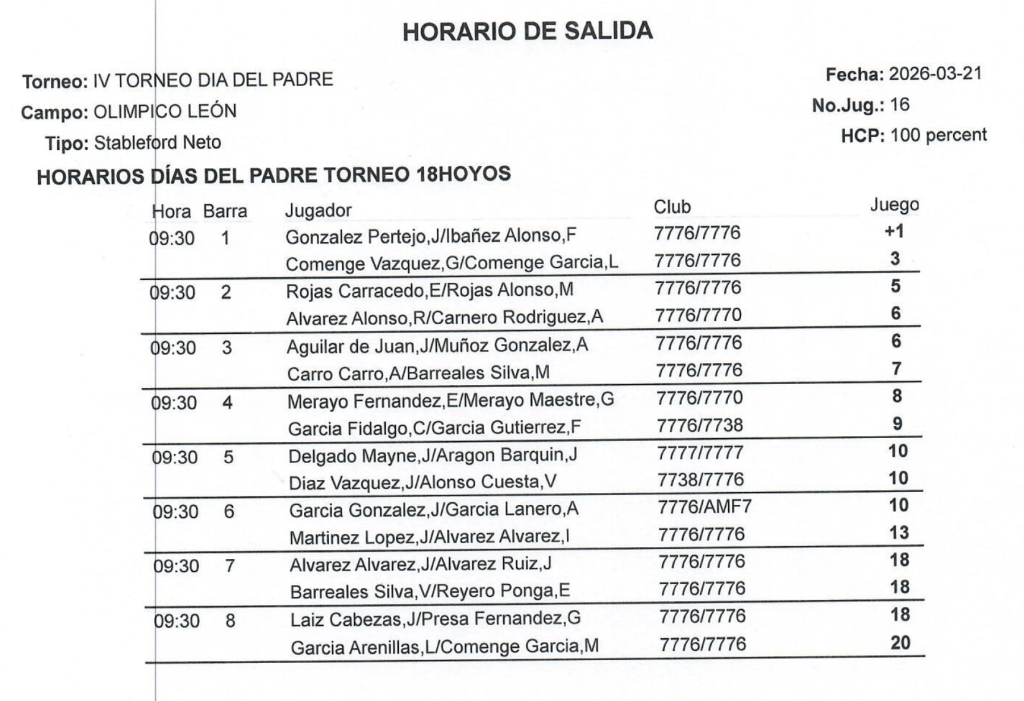 SALIDAS IV TORNEO DIA DEL PADRE 2026 / OLIMPICO DE LEON por Golf por Asturias en 21 marzo, 2026 SALIDAS 9 HOYOS SALIDAS 18 HOYOS Compártelo: Compartir en X (Se abre en una ventana nueva) X Comparte en Facebook (Se abre en una ventana nueva) Facebook Me gusta Cargando...