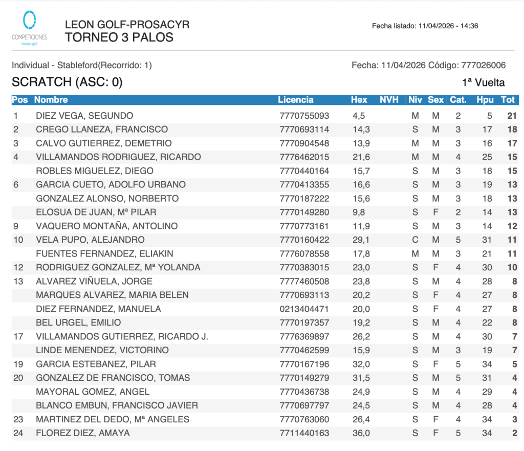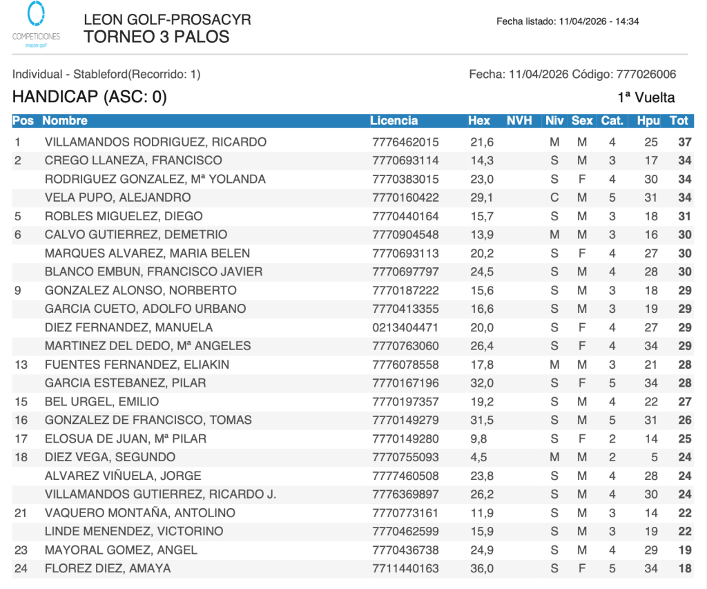 Resultados Torneo 3 Palos 2026 / Club Golf Leon por Golf por Asturias en 11 abril, 2026 Segundo Diez Vega gana el Scratch con 21 puntos y el Handicap fue para Ricardo Villamandos Rguez. con 37 puntos CLASIFICACION SCRATCH CLASIFICACION HANDICAP Compártelo: Compartir en X (Se abre en una ventana nueva) X Comparte en Facebook (Se abre en una ventana nueva) Facebook Me gusta Cargando...